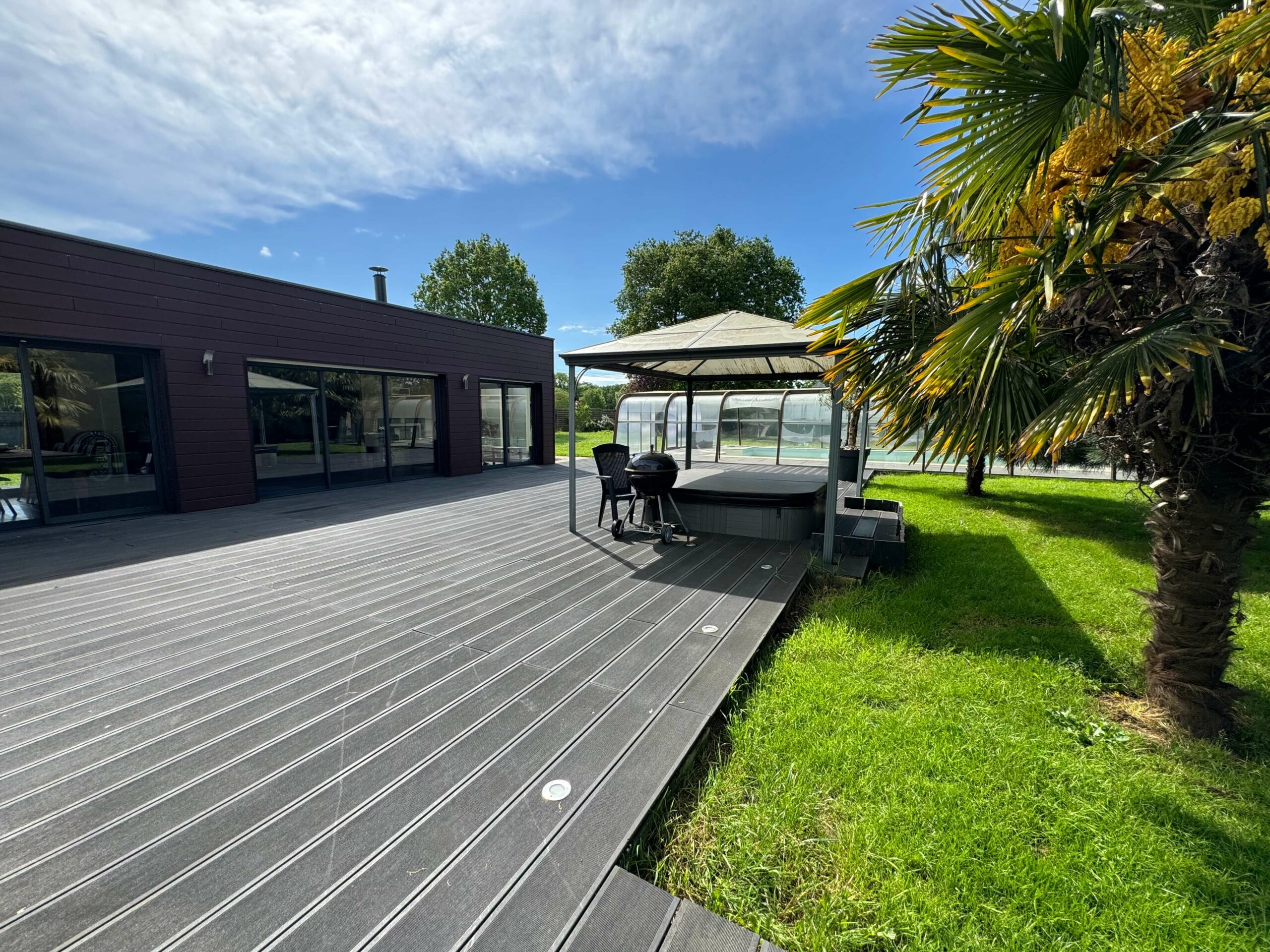 – au rez-de-chaussée : un hall d’entrée avec placard donne sur un vaste séjour-salle à manger, salon, coin feu et cuisine semi-ouverte aménagée et équipée par du matériel de qualité, tout cet espace mesure 71m² et ouvre sur une vaste terrasse entourant la maison ; une suite parentale comprenant un grand dressing aménagé, une salle d’eau privative et ayant un accès direct à la terrasse ; un bureau ; un séjour supplémentaire de 46m² ayant son propre accès à l’extérieur également ; une arrière-cuisine aménagée et équipée ; des WC séparés