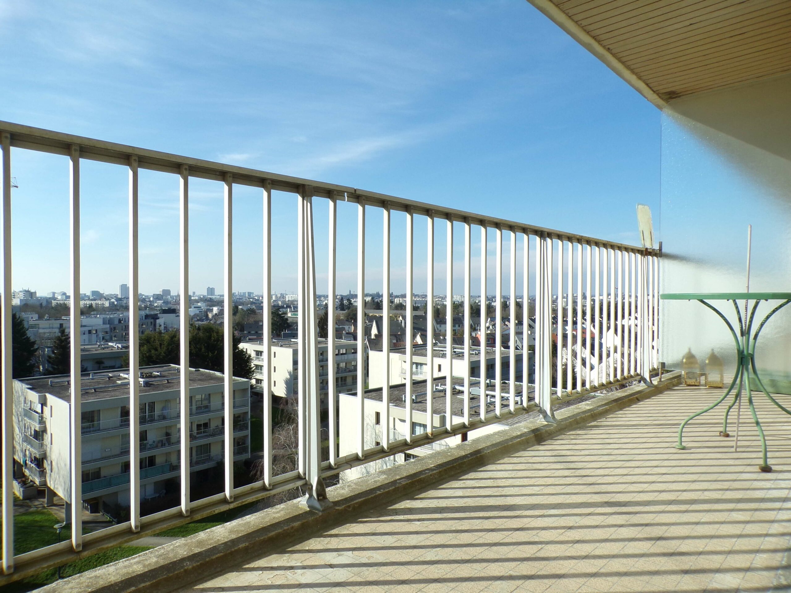 Quartier du Landry : au calme d’un petit parc paysager, à 2min à pied du parc du Landry, à 30sec à pied des transports et commerces, en étage élevé avec ascenseur, un appartement de type 2 comprenant une entrée/dégagement avec placard, un grand séjour lumineux et ouvert sur grand balcon de 10m² sans vis-à-vis exposé plein Ouest avec vue sur le centre ville de Rennes, une cuisine aménagée ouvrable sur le séjour, une chambre, une salle d’eau, WC séparés.